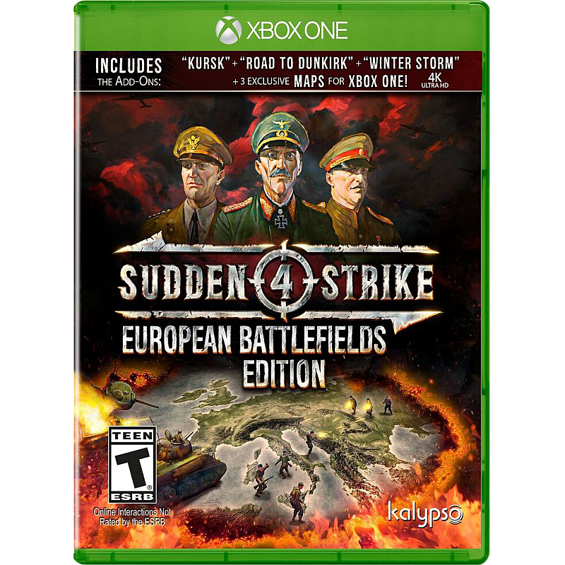 Втората световна война, в реално време, твърдата стратегия достига Xbox One! Внезапна стачка 4: Европейското издание на бойното поле предлага финалните фенове на колекцията, съдържащи основната игра внезапна стачка 4, плюс добавки битка на Курск, внезапна стачка 4: път към Дюнкерк и Финландия - зимна буря, както и три изключителни карти Xbox. С общо 31 мисии в 5 взискателни кампании и над 120 автентични военни единици, внезапна стачка 4: Европейското издание на бойните полета предлага стотици часове стратегически предизвикателства. Използвайте слабостите на вражеските танкове, организирайте перфектната засада, заемайте пехотни сгради, надвишавайте врага или освобождавате опустошителни атаки - докато приближавате всяка мисия зависи от вас!