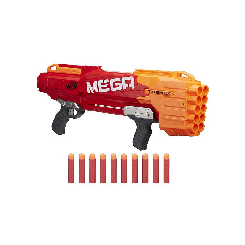 Nerf N-Strike, пистолет-играчка Mega Twinshock С бластера Nerf N-Strike MEGA TwinShock можете да влезете в битката с двойни сили, изстрелвайки два снаряда едновременно.