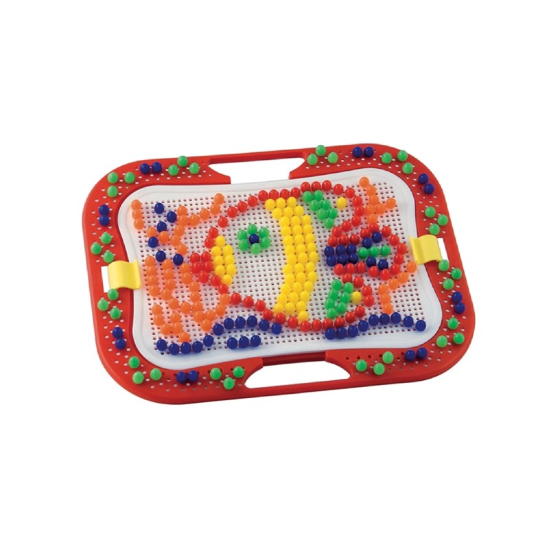 Този комплект съдържа 300 цветни части под формата на пластмасови карфици, които децата могат да поставят върху перфорирана дъска, за да създават различни картини, шарки и мозайки.