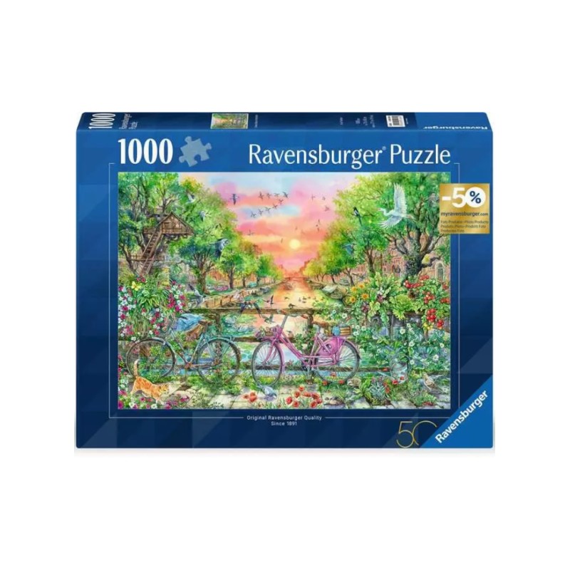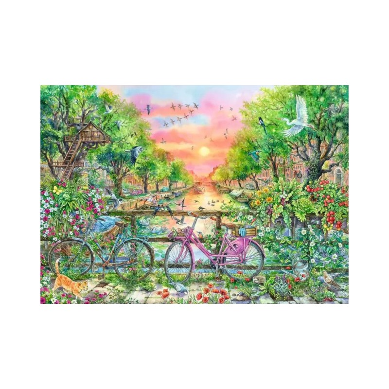 Пъзелът Ravensburger Bicycles in Amsterdam от 1000 части ви кани да изследвате живописната атмосфера на Амстердам, заснемайки емблематични изображения на велосипеди, подредени по бреговете на канала.