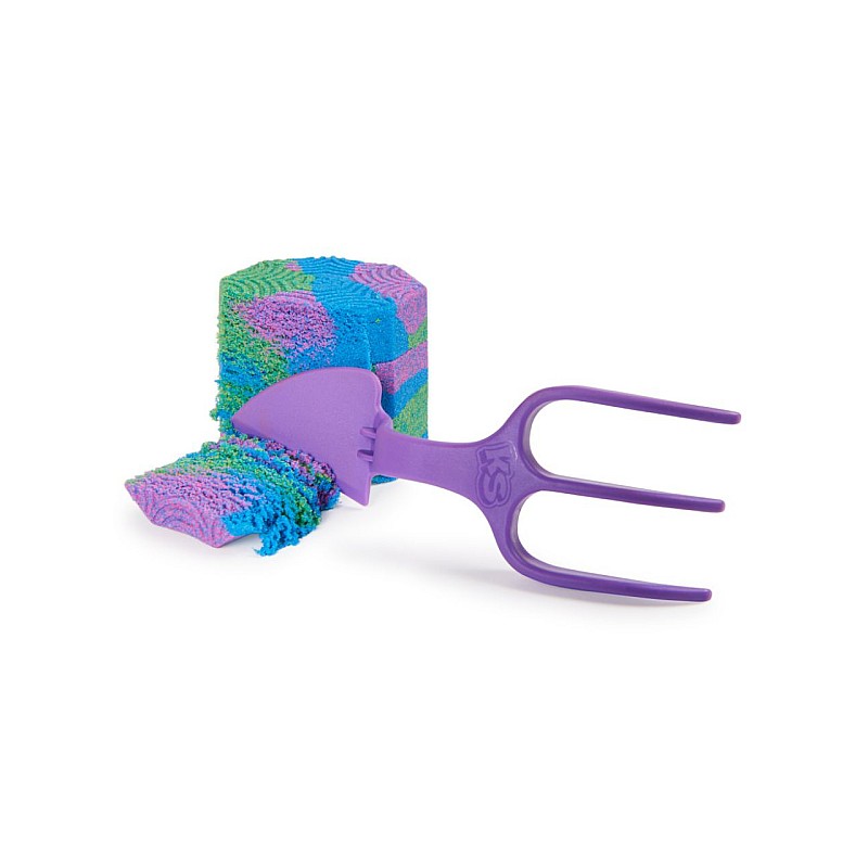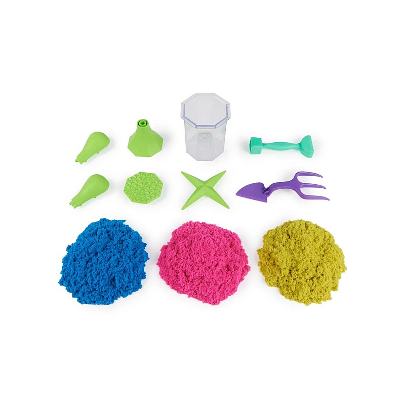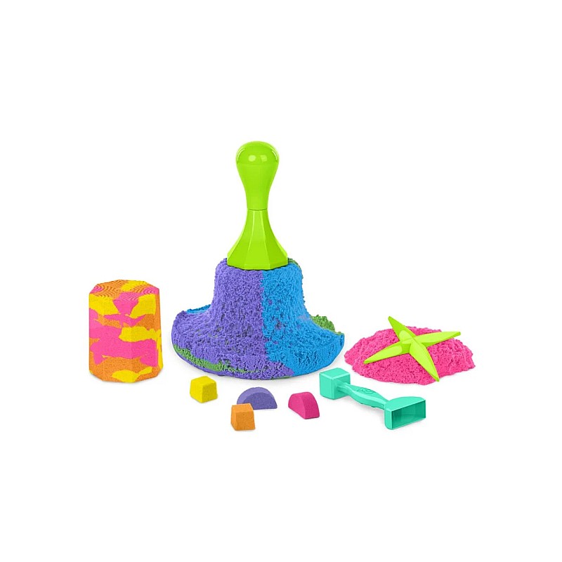 Този комплект Kinetic Sand е пълен с всичко необходимо за създаване на пясъчни изненади, общо 382 g син, жълт и розов пясък.