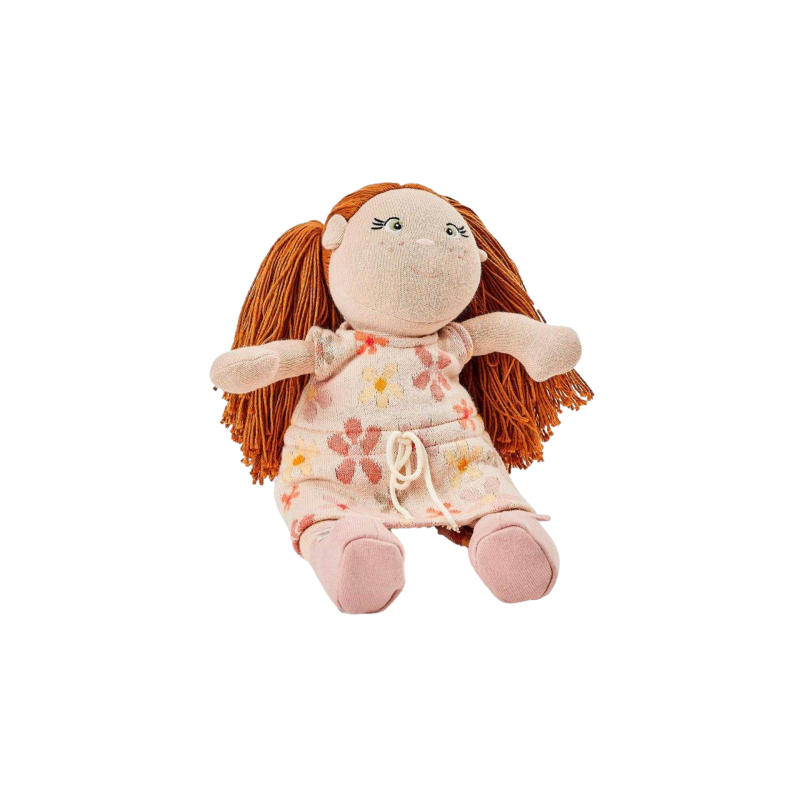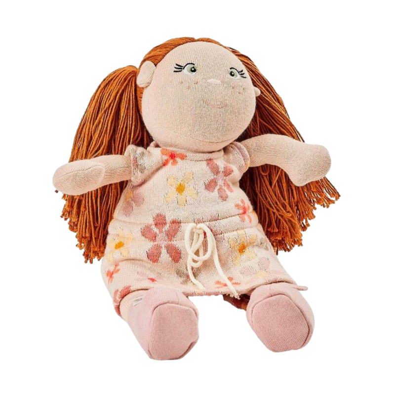 Малка кукла "Роза" с червена коса и бродирани детайли по лицето. Дрехите на куклата се свалят и се състоят от розова рокля на цветя, розови обувки и раиран чорапогащник.