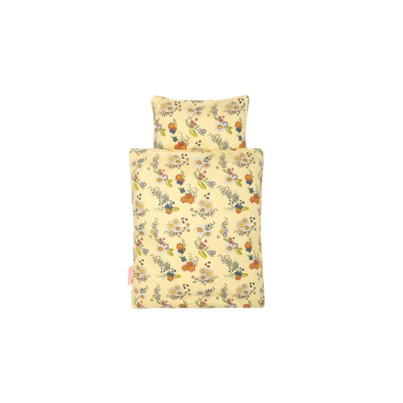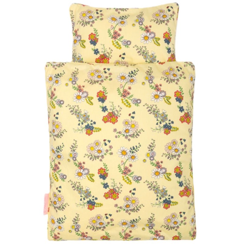 Спално бельо за кукли Smallstuff фино спално бельо в жълто с цветя в нюанси на синьо, червено, зелено и жълто.