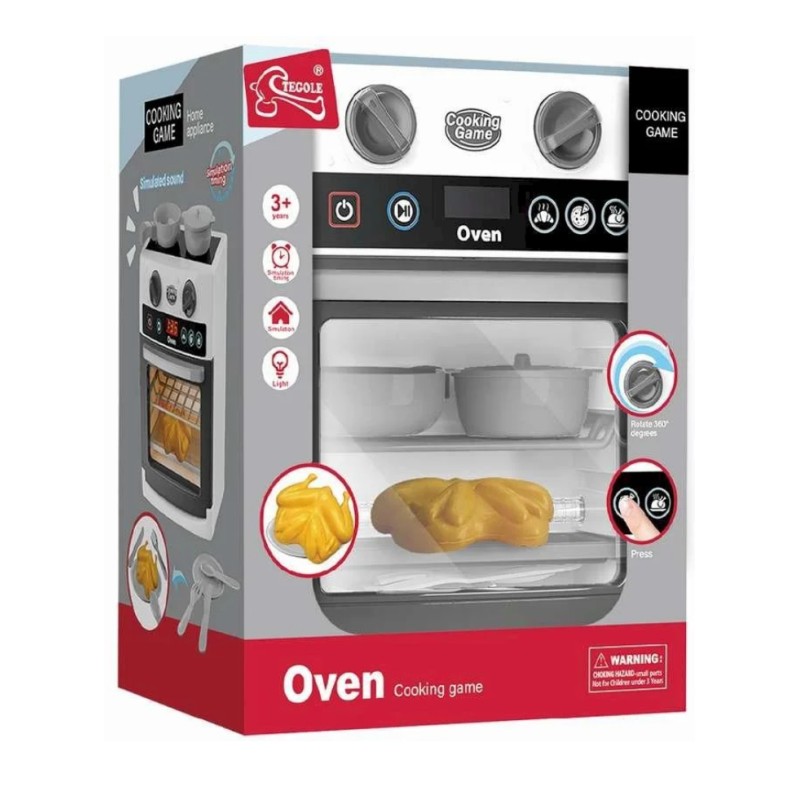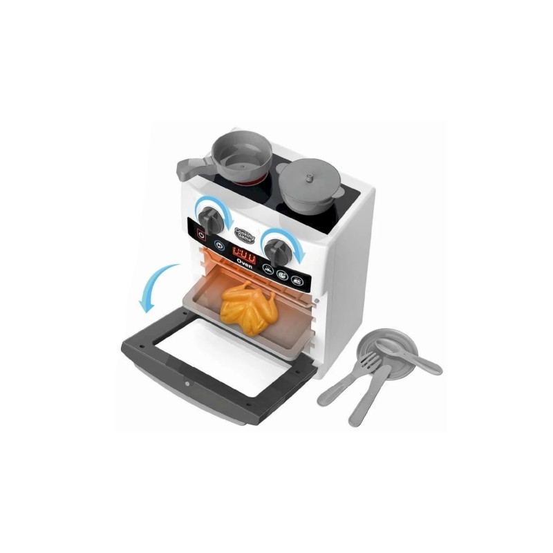 Тази печка и фурна с 2 котлона се доставя с тиган, тенджера с капак, пиле, чиния и прибори за хранене.