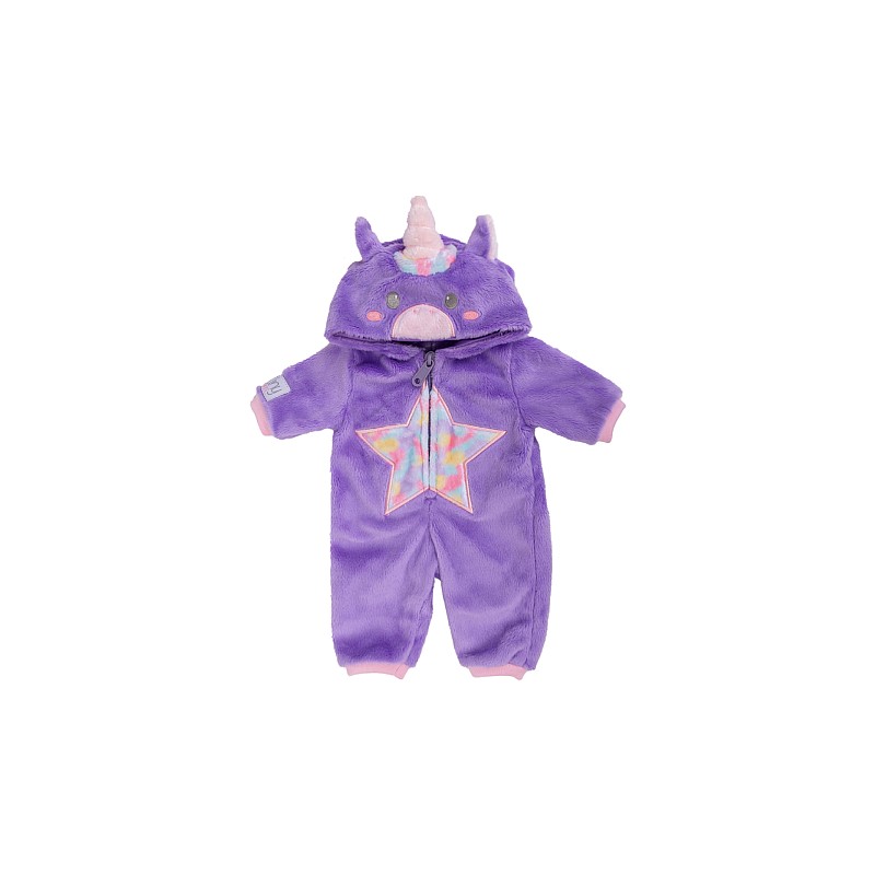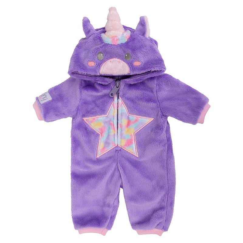 Изящни дрехи за кукли Tiny Treasures, състоящи се от лилав слоен гащеризон с цветна звезда на корема и качулка с лице на еднорог, уши и рог.