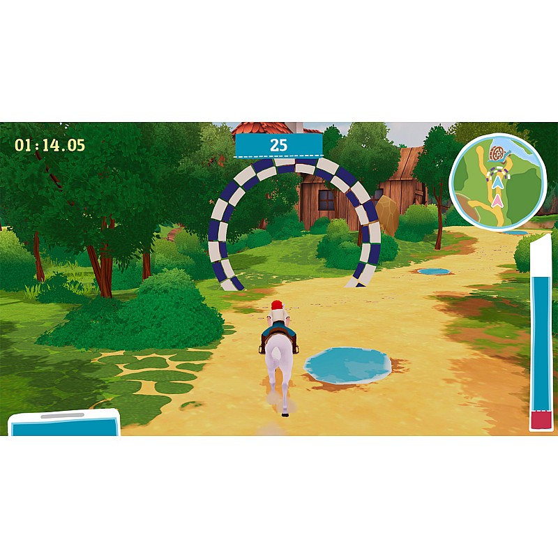 Climb up and see what damage the storm has done, ride across the fields, jump over numerous obstacles and have Bibi the witch magically remove the mess.