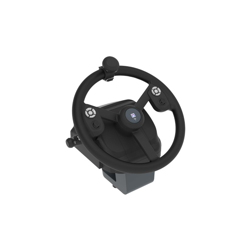 The agricultural vehicle control system includes a rubberized steering wheel inspired by real vehicles, as well as a joystick and turn signal button for realistic simulation and control.