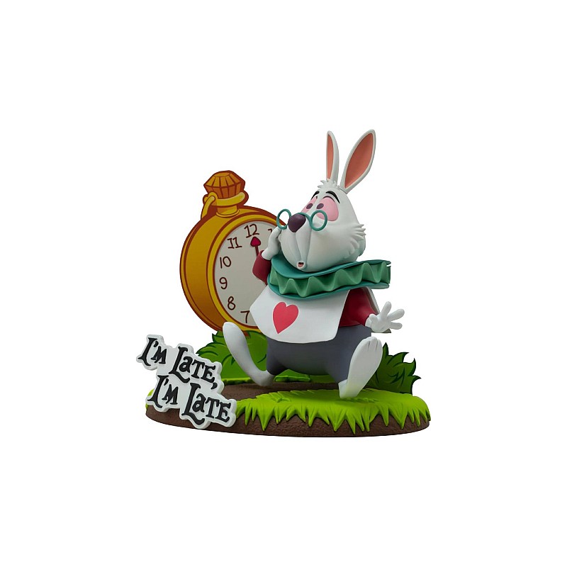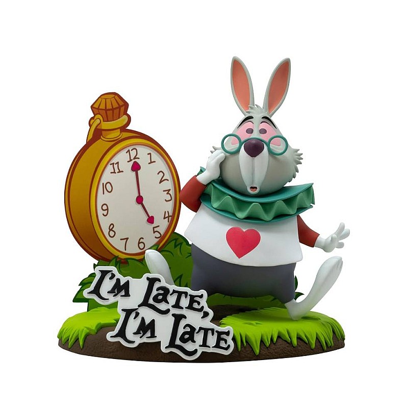 This figurine shows the White Rabbit with his pocket watch and the message ''I'll be late!'' written on the figurine's stand.