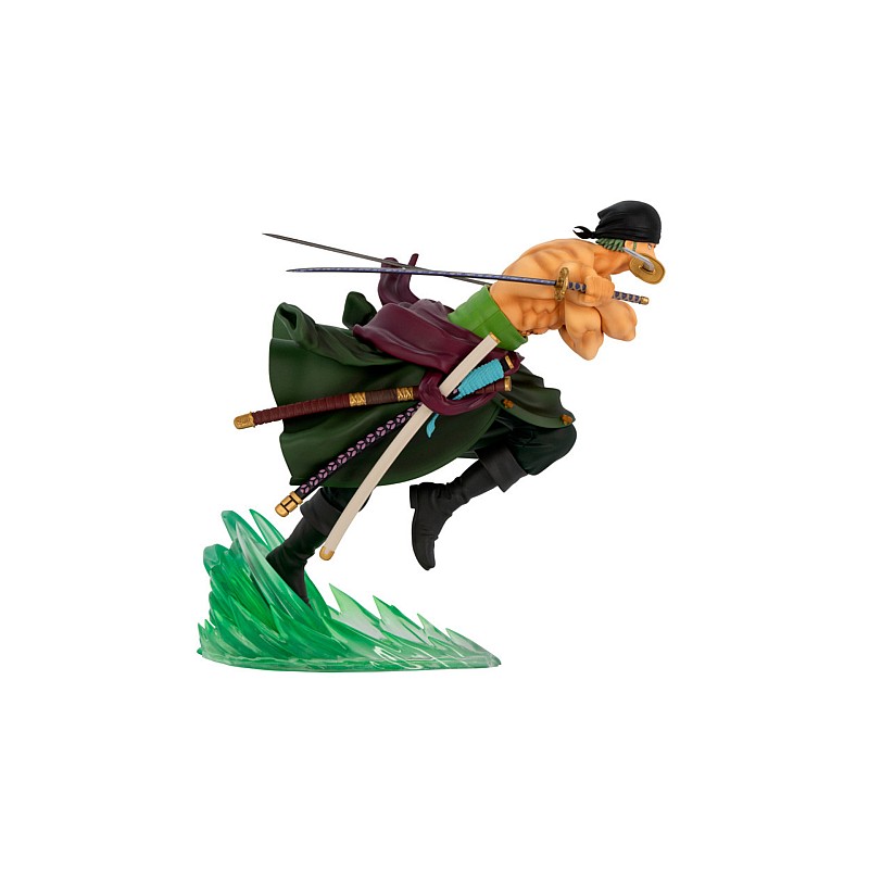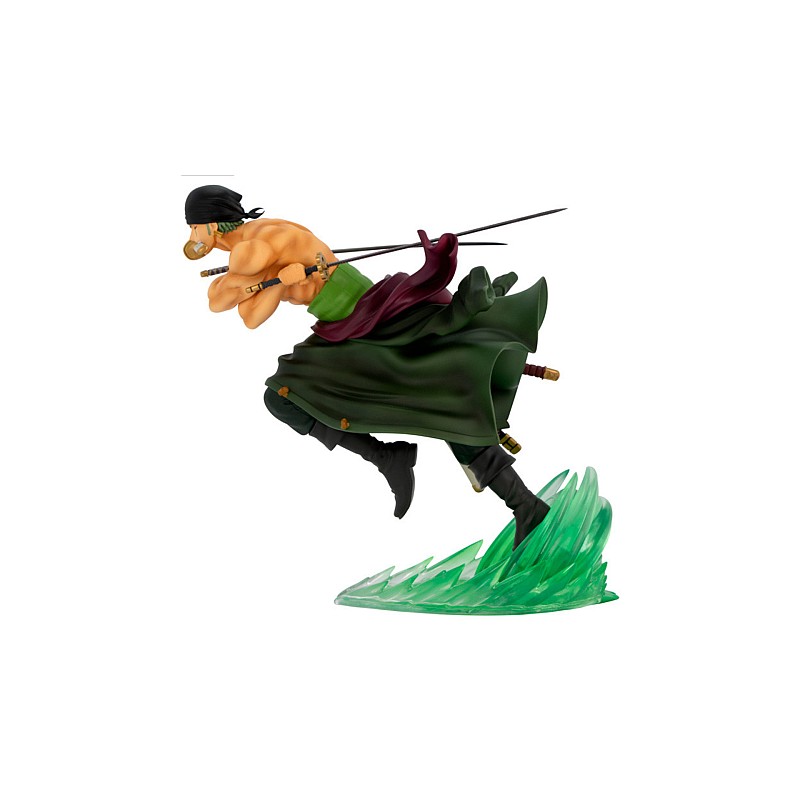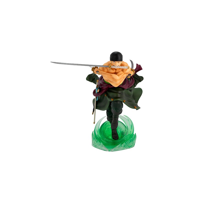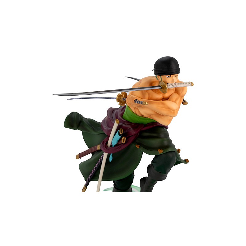 The figure is crafted with great attention to detail, reflecting Zoro's iconic features such as the green tunic, the bandage over his left eye and his sword, Santoryu (the traditional three-sword fighting style).