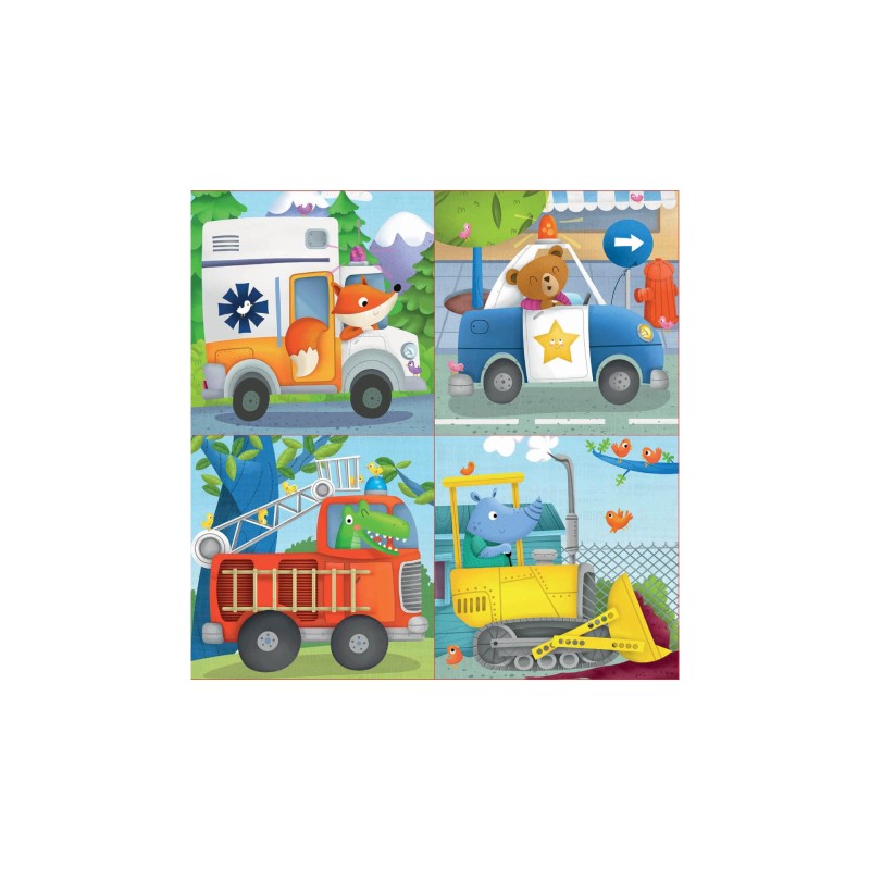 Discover four wonderful motifs of interesting commercial vehicles with the Educa puzzle set: fire engine, ambulance, excavator and police car.