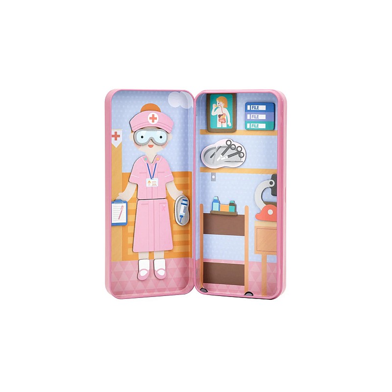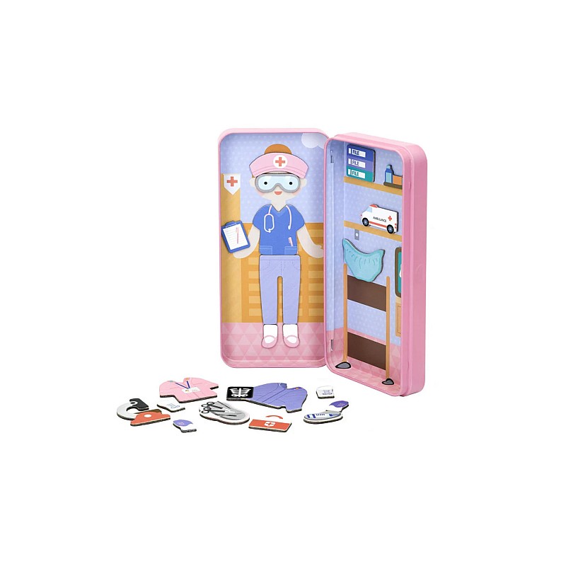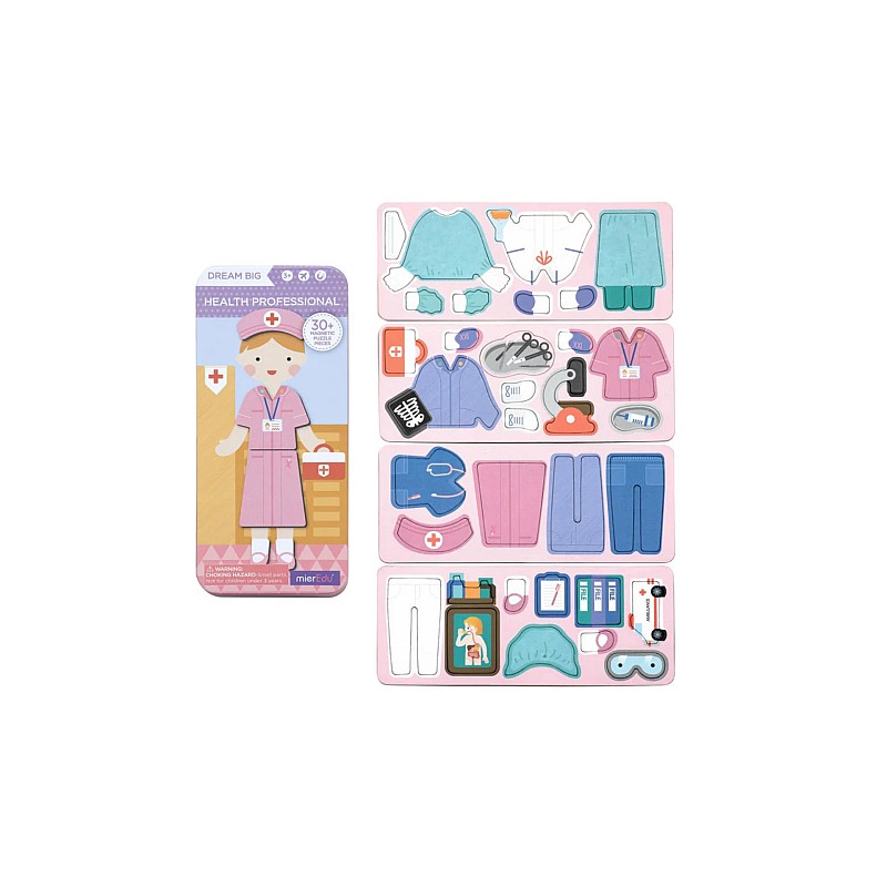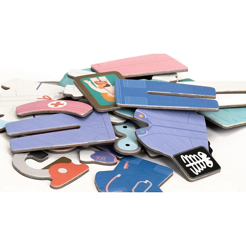 The Healthcare Professionals set includes two scenes and more than 30 magnetic puzzle pieces where they can dress up their character and make up their own stories.