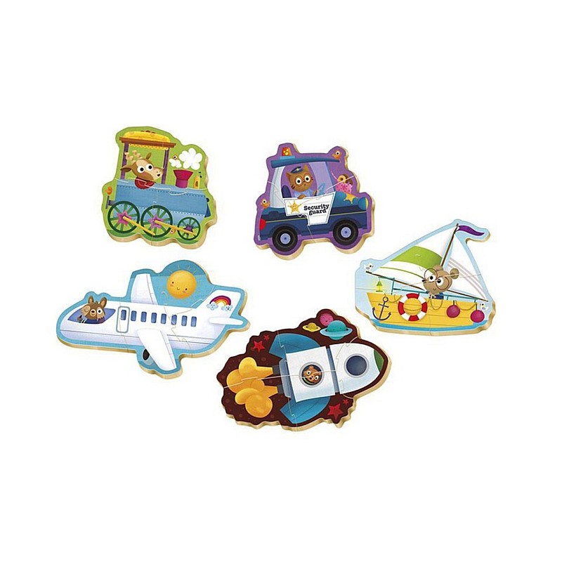 If your little one likes animals and vehicles, they'll love these five progressive puzzles: a mouse on a boat, a kitten driving a police car, a bear on a rocket, a gazelle on a train and a squirrel on a plane.