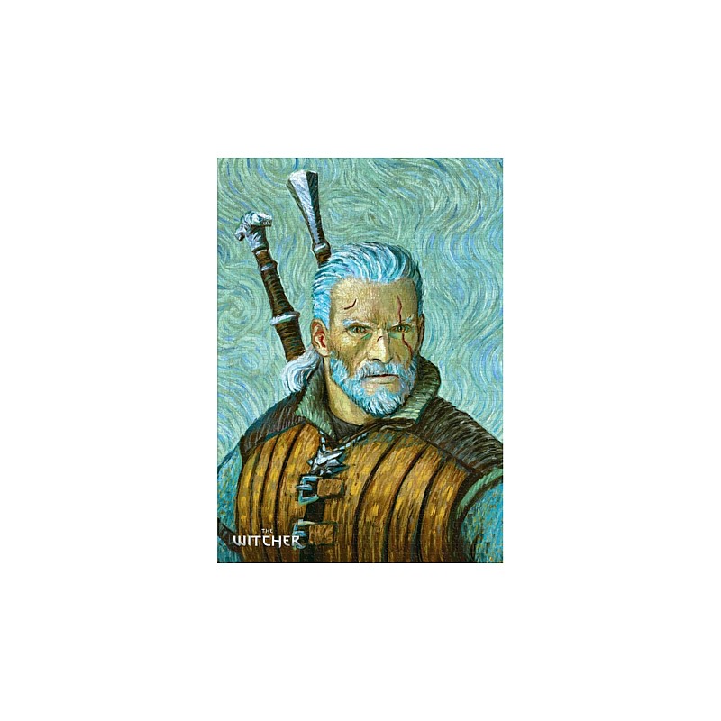 The puzzle features a fascinating illustration of Geralt of Rivia, the main character of The Witcher, in an artistic interpretation that reflects the techniques and visual style of van Gogh, creating a spectacular fusion between video games and classical art.