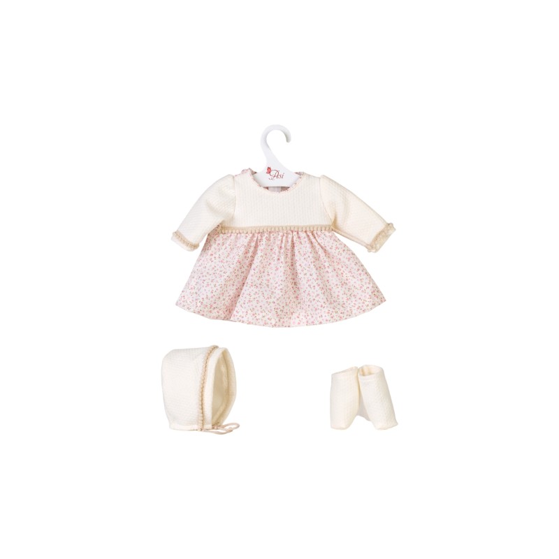 Designed for 43 cm dolls, this set has a charming floral dress with a light -colored knit bod and beige details.