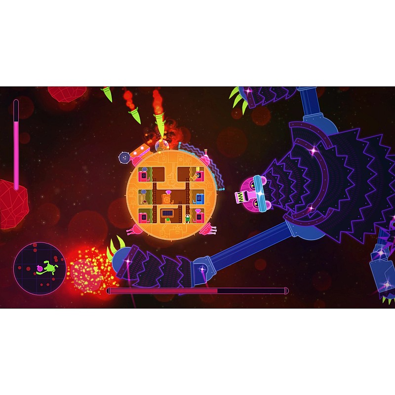 Explore a colorful galaxy in a massive neon battleship that you control together by maneuvering turrets, lasers, shields and thrusters.