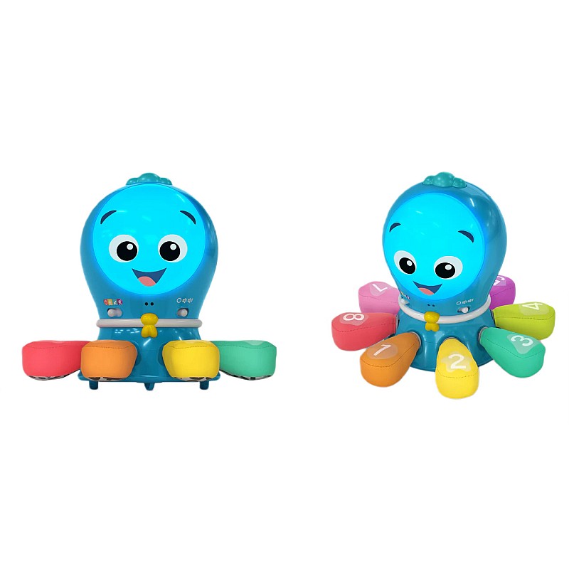The opposite comes to life and render songs in English, German, French and Spanish. It touches a soft tentac in Tummy Time mode to see the opposite, glowing, spinning and singing.