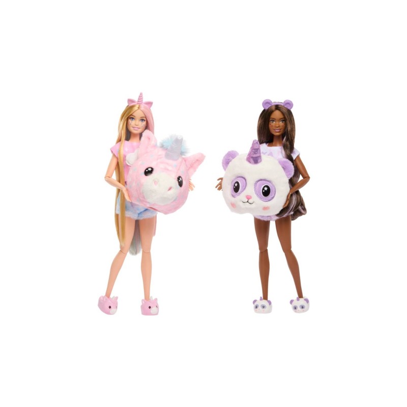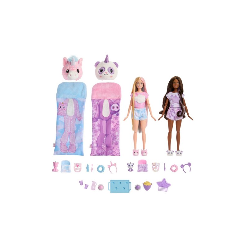 Cozy Cute Tees Slumber Party features two Barbie 'Malibu' and Barbie 'Brooklyn' Cutie Reveal dolls, two pets and lots of fun during the night.
