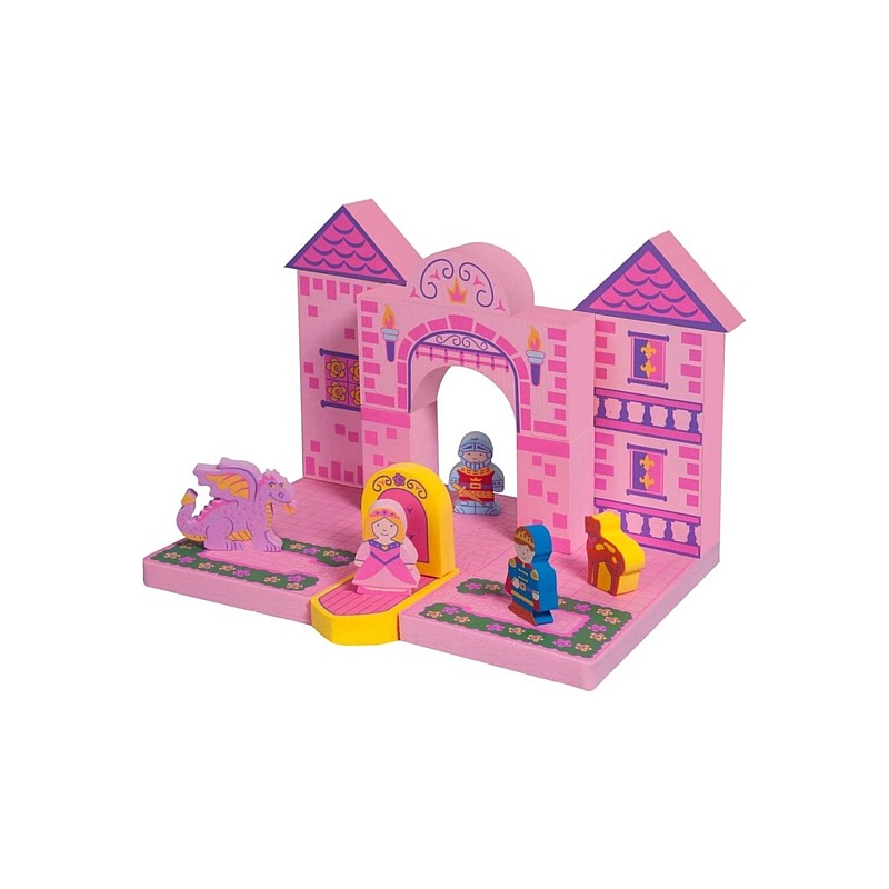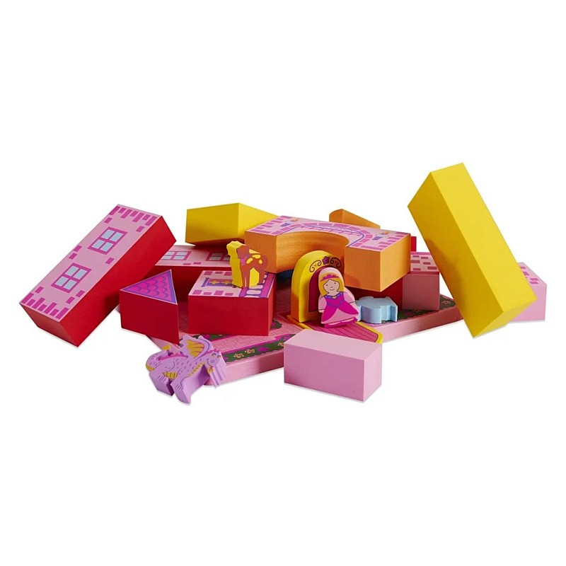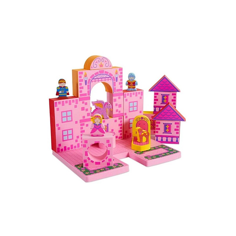 Includes a variety of soft foam building blocks and prince, princess, knight, dragon and hound figures.