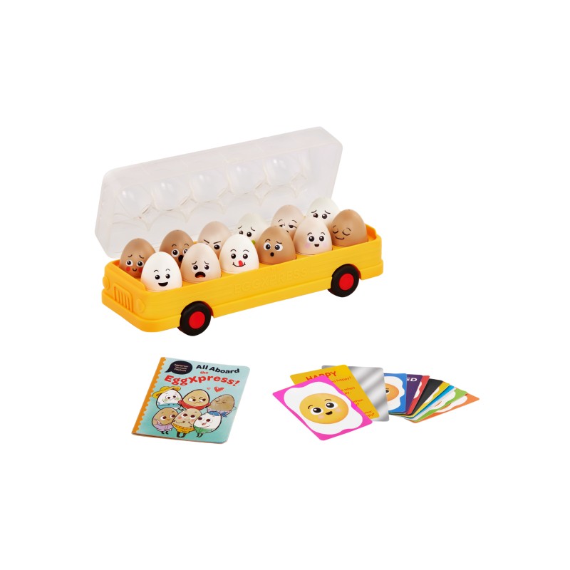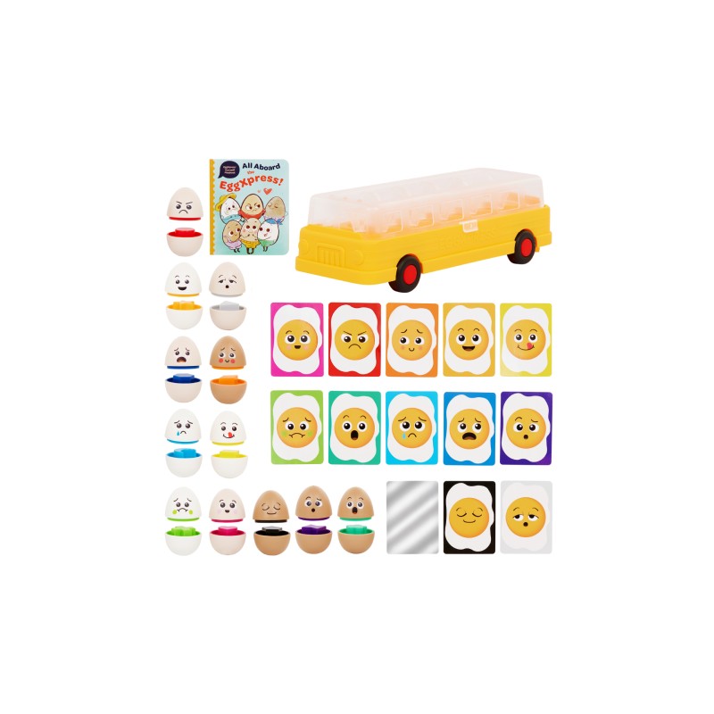 39-piece set: Match, learn, reflect and express yourself with eggs, expression cards, a mirror book and a toy bus!