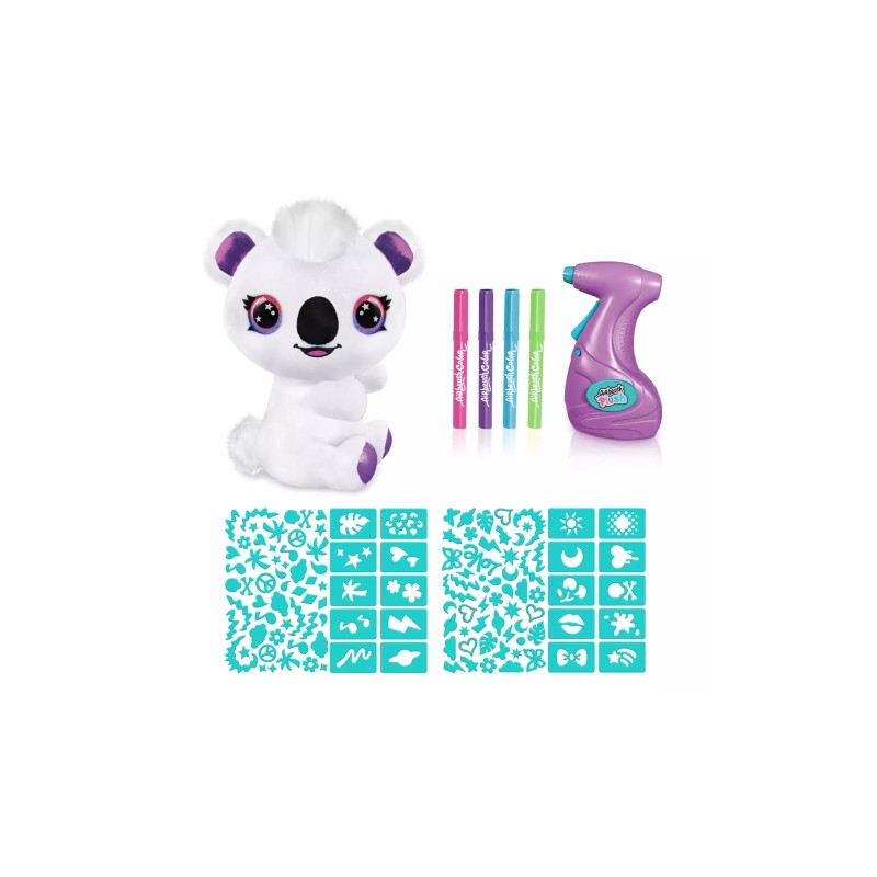 Draw and create your own multi-colored plush with the help of the battery-operated airbrush gun and glued-on templates.