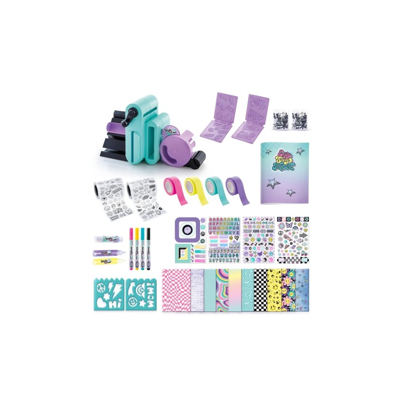 The set includes a notebook, embossing cards, sticker sheets, gem bags, markers, glitter glue, glue, pattern papers, adhesive tapes, sticker rolls, templates and instruction manual.