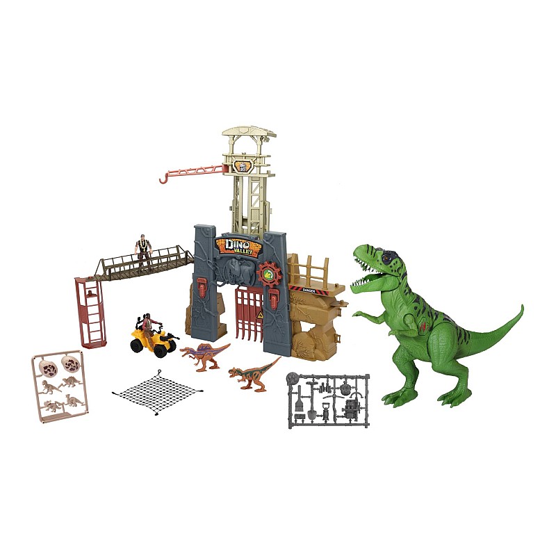 Includes two action figures, T-Rex, capture net, bridge, smaller dinosaurs, dinosaur eggs that snap together to contain baby dinosaurs and extra accessories.