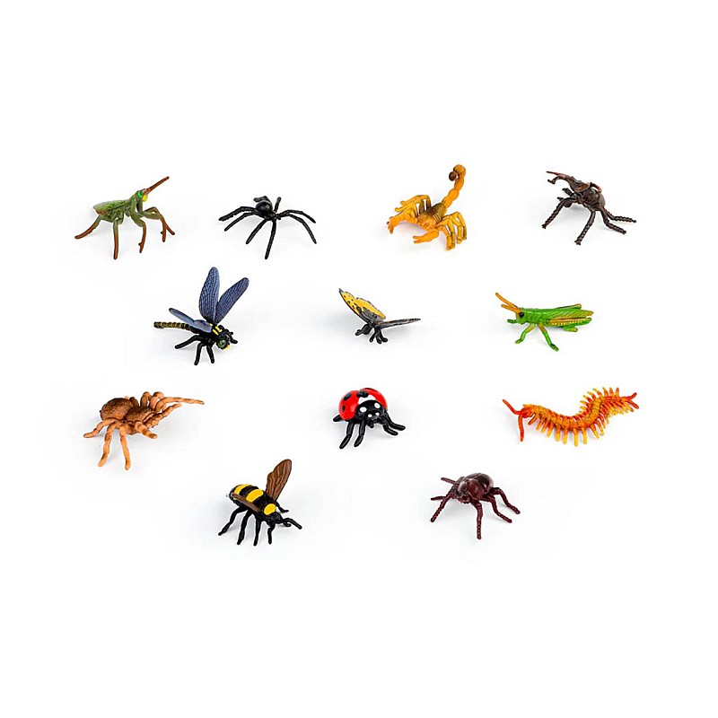Contains 12 mini creatures: Mexican Red Knee Tarantula, Dragonfly. Praying mantis, bumblebee, stag beetle, scorpion, tortoise shell butterfly, black widow spider, ladybug, grasshopper, rhinoceros beetle and millipede.