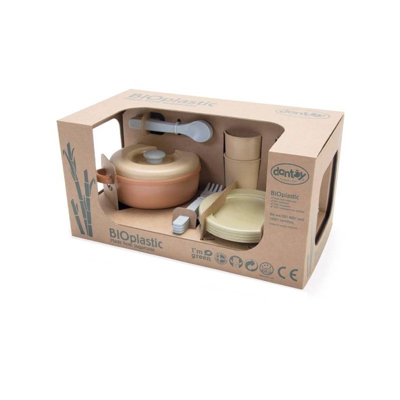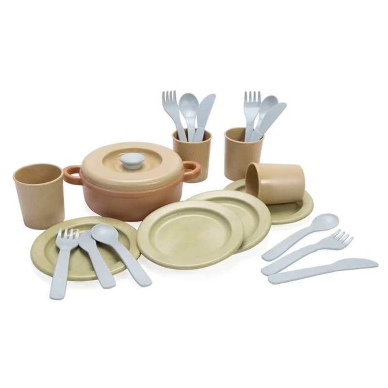 The 22-piece playset promotes interaction between children and adults through imaginative play. Includes 4 plastic plates, cups, spoons, knives, forks and 1 pot with lid.