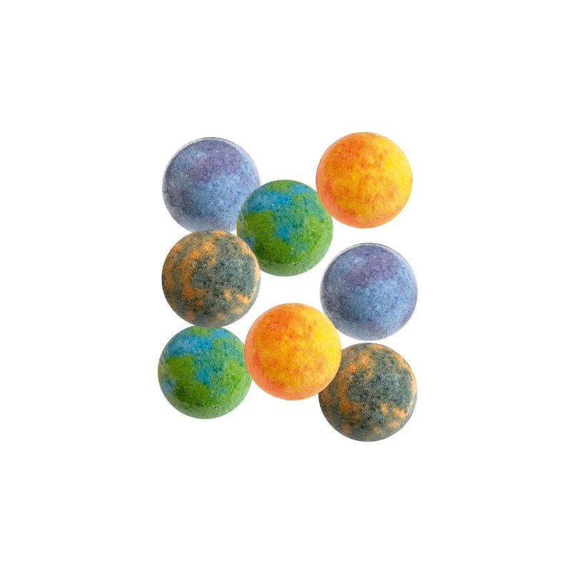 With an effervescent effect and releases a delightful fruity perfume, in the seven planet-shaped bath bombs.
