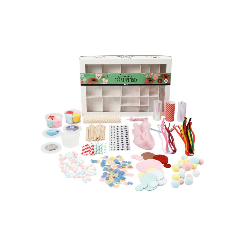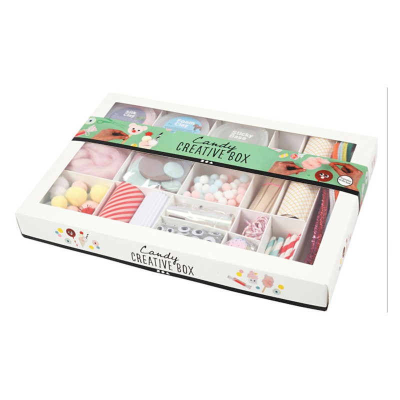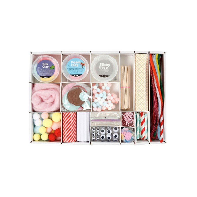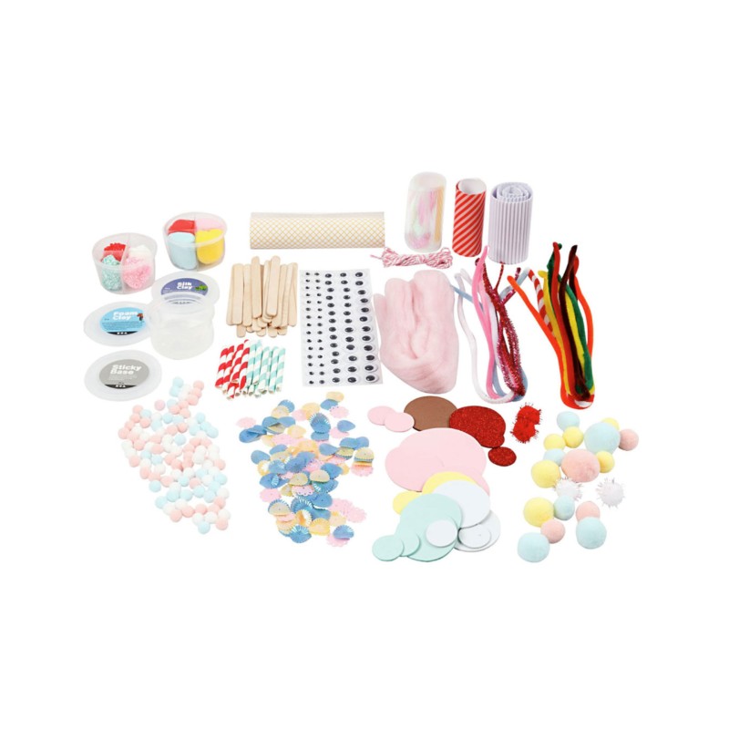 Product includes: foam clay, silk clay, adhesive base, yarn, pompoms, patterned paper, corrugated cardboard, self-adhesive googly eyes, iridescent cellophane, cotton cord, Eva foam circles, sequins, popsicle sticks, chenille (cleaner of pipes) and small paper straws.