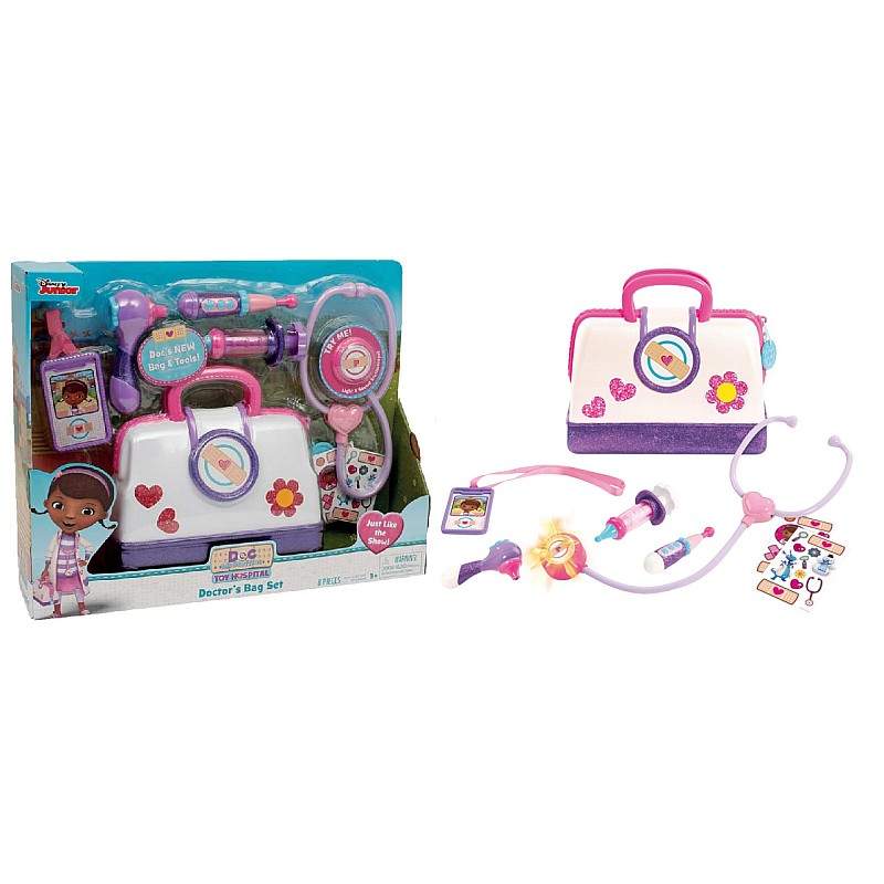 The Doc McStuffins Toy Hospital Bag Playset includes several tools and a light-up stethoscope.
