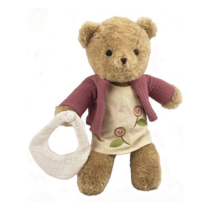 Morrissette is a soft teddy bear, dressed in a charming dress.
