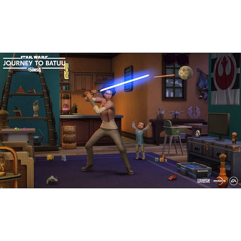 - When your Sim returns home, bring new decorations and recipes inspired by your travels, play a game of sabacc, or host a playful lightsaber training session.