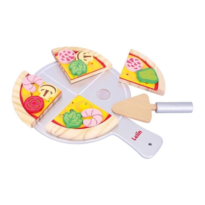 The Lelin Play Food Pizza set includes 4 play pizza slices that you can customize with 5 different toppings, along with a wooden pizza serving tray and a spatula.