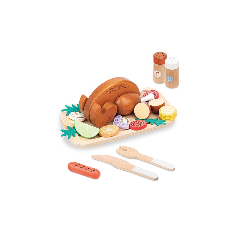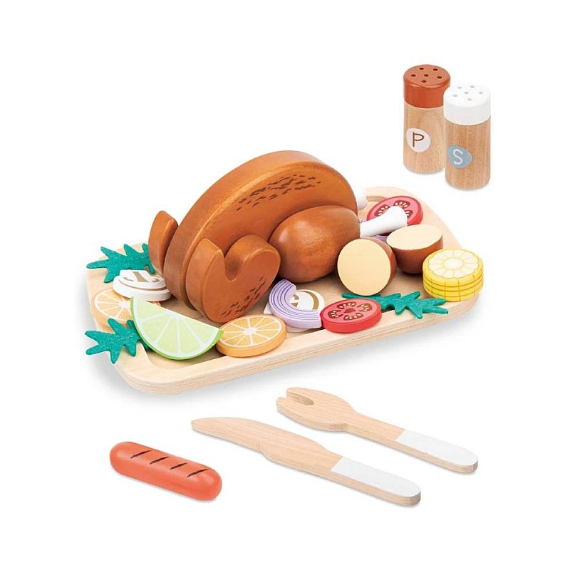 It includes a wooden plate, a wooden turkey and a variety of wooden and felt accessories, allowing your child to prepare and serve a delicious roast chicken meal.