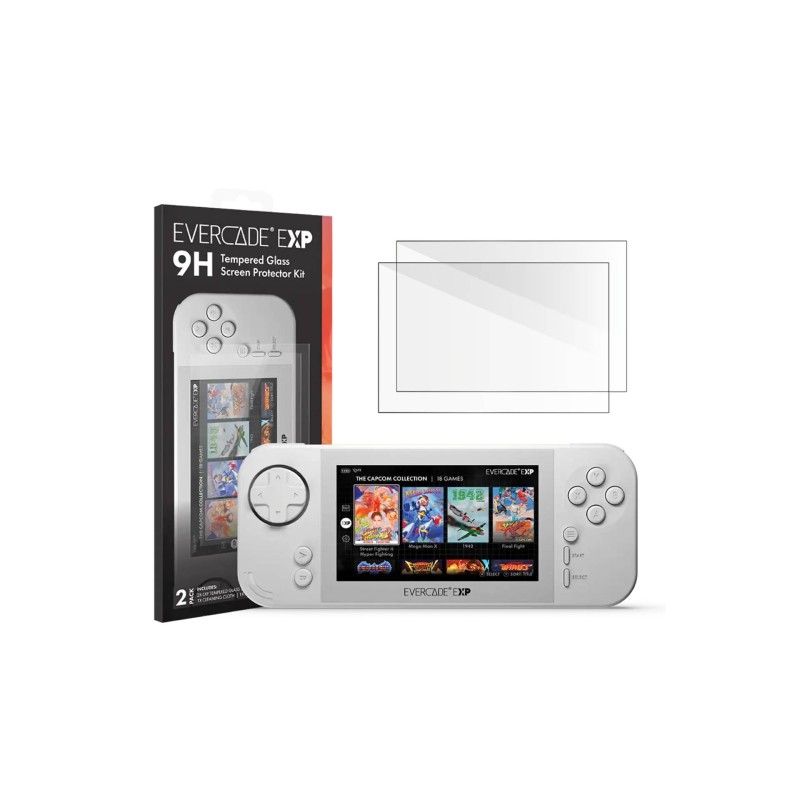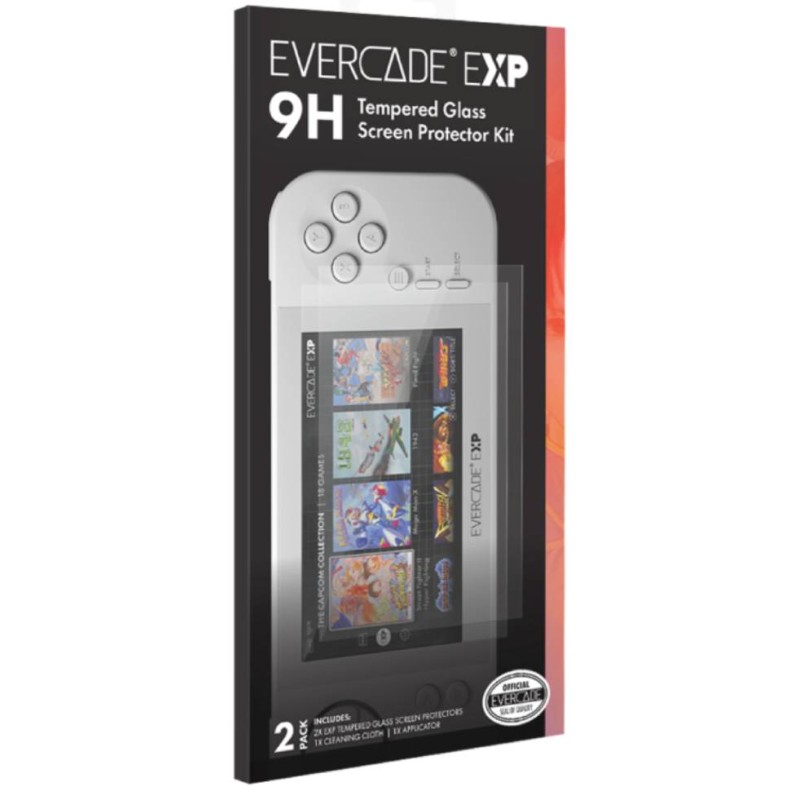 Compatible with Evercade EXP and Evercade EXP Limited Edition consoles. The package includes 2 tempered glass screen protectors, a cleaning cloth and an applicator specially designed for Evercade EXP.