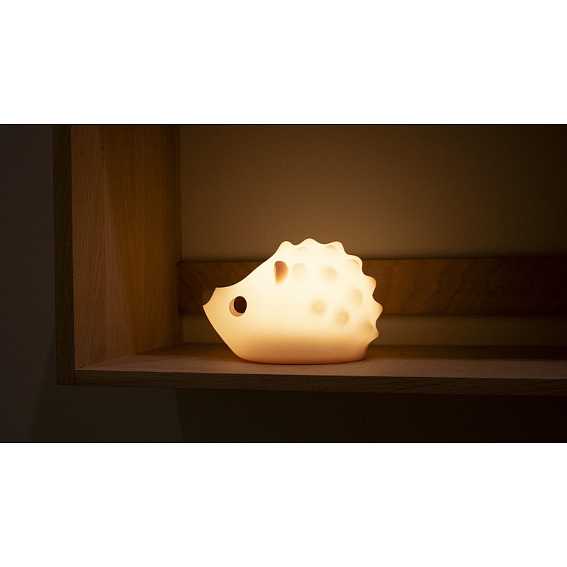 The cute hedgehog lamp is made of soft and calm beige silicone and comes with a rechargeable battery (USB charger).
