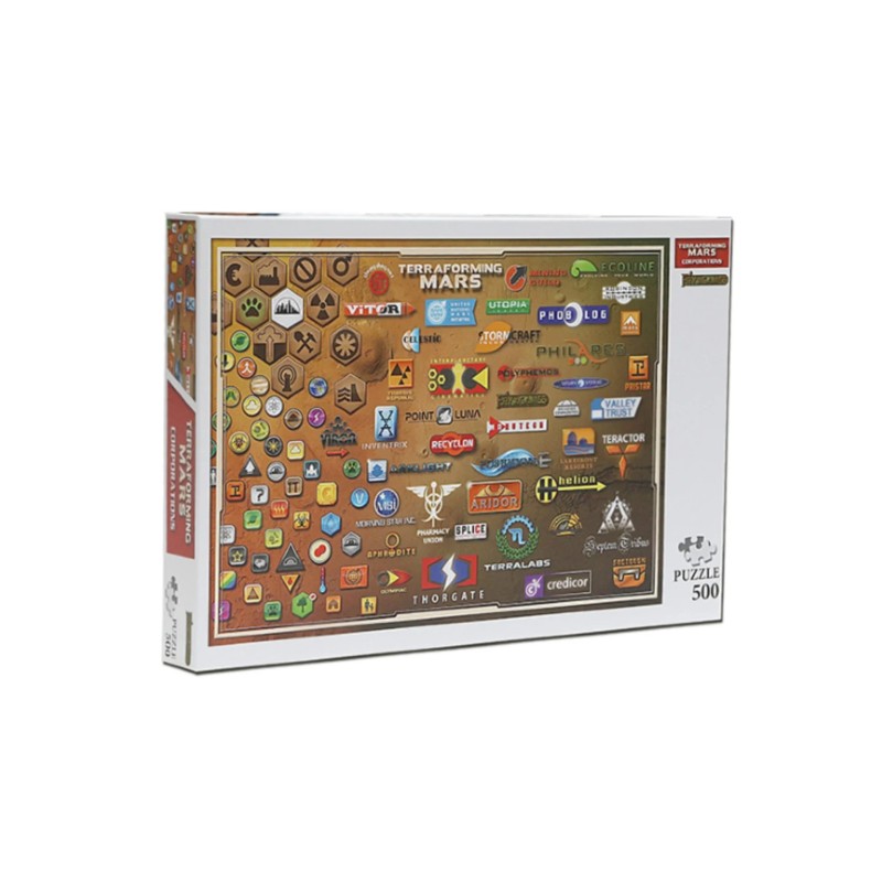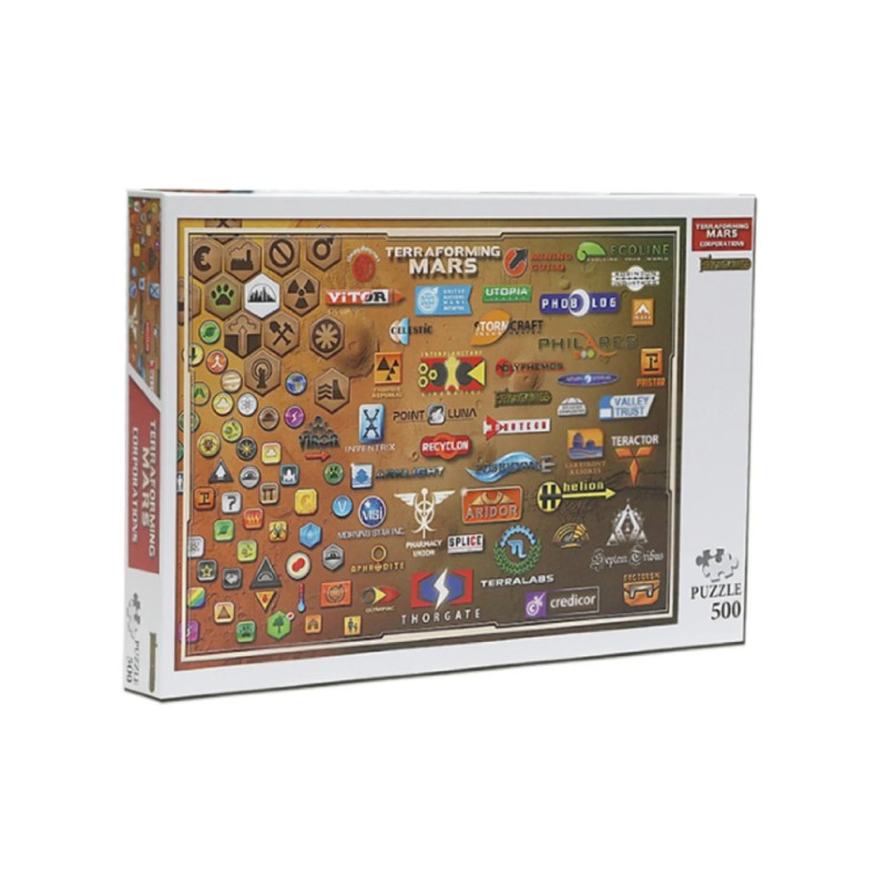 Although never released as a corporation card, the name and logo of the Olympiac corporation were revealed with Terraforming Mars: Corporations Puzzle, a puzzle featuring various game design elements including logos, tiles, labels, symbols of resources and icons.