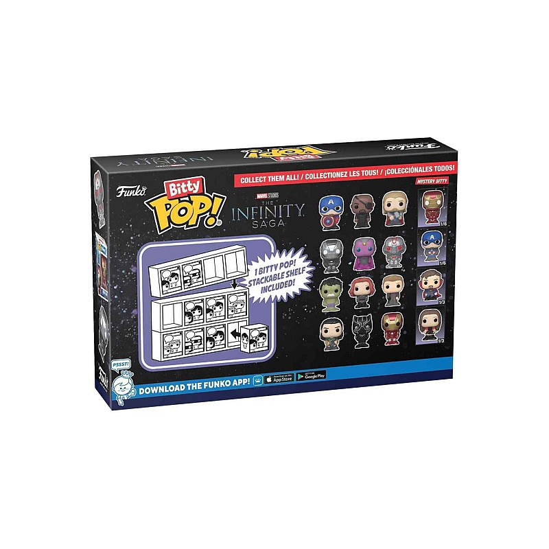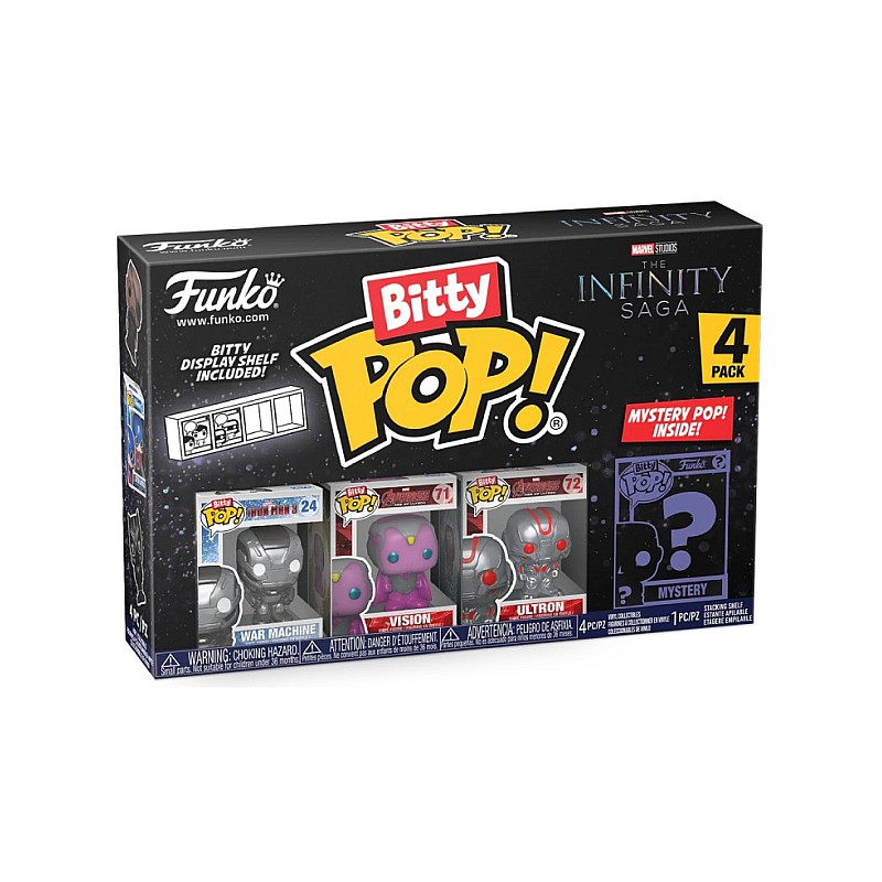 This 4-pack includes Bitty Pop figures! War Machine Bitty Pop! Vision, Bitty Pop! Ultron and a Bitty Pop! mysterious.