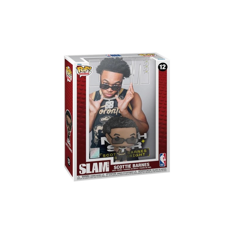 This collector's item features the cover of Pop! Scottie Barnes in his black away uniform against a background that represents him on the cover of SLAM Magazine.