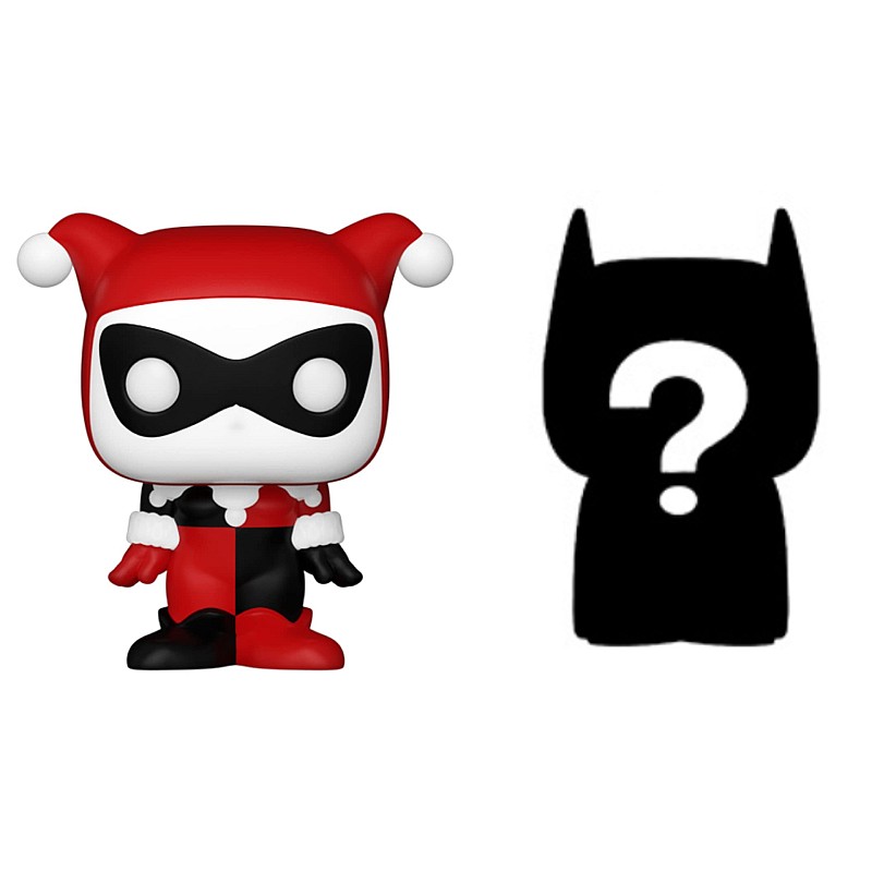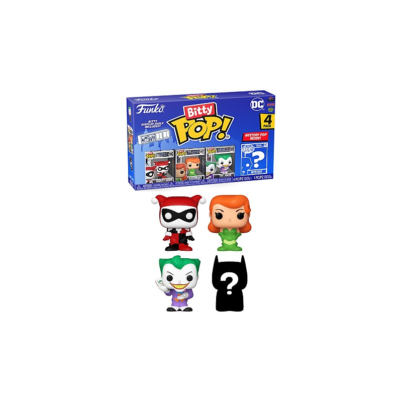 This pack includes 4 Bitty Pop! figures: Harley Quinn(TM), Bitty Pop! Poison Ivy(TM), Bitty Pop! The Joker(TM), and a Bitty Pop! mysterious.