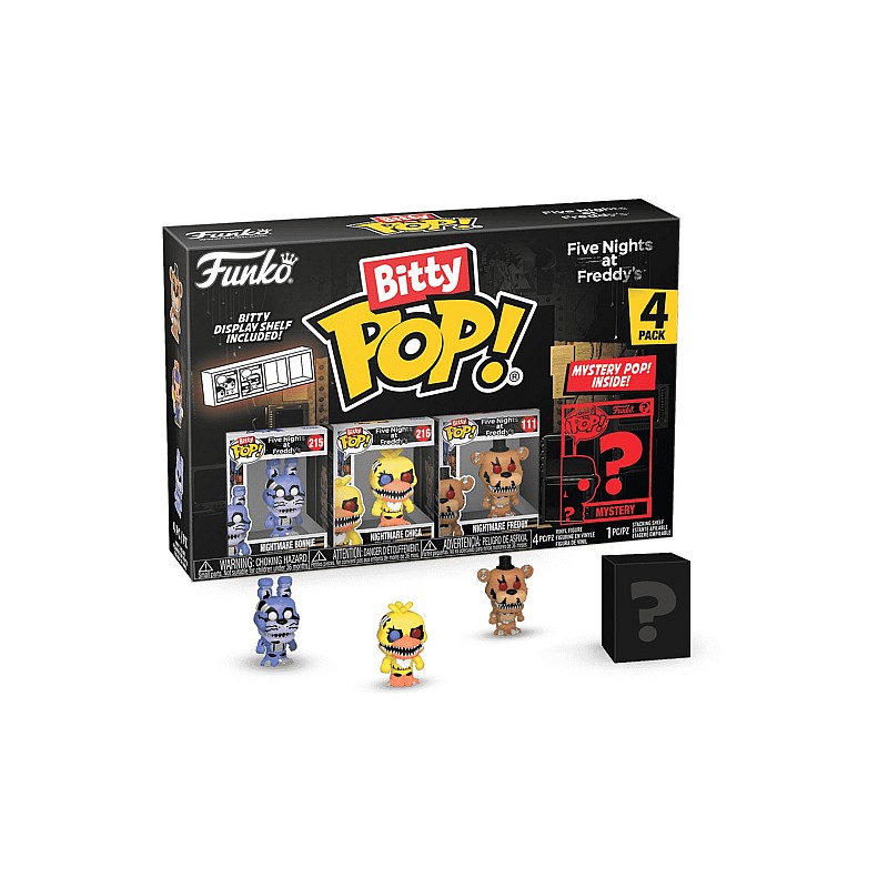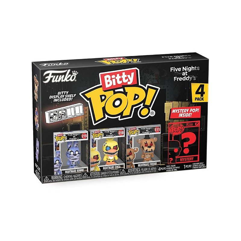 This 4-pack includes Bitty Pop Nightmare Bonnie, Bitty Pop Nightmare Chica, Bitty Pop Nightmare Freddy figures.