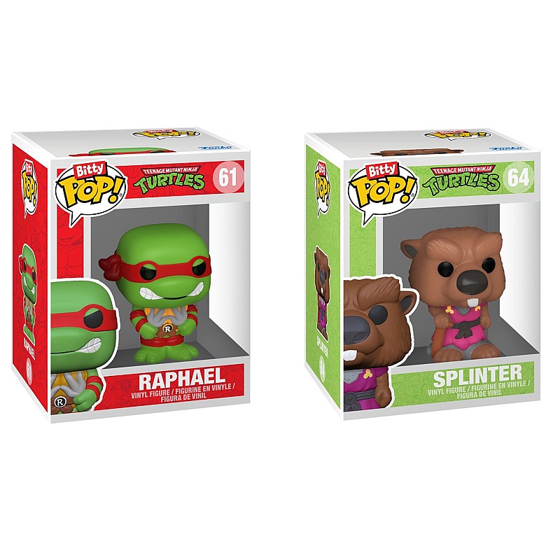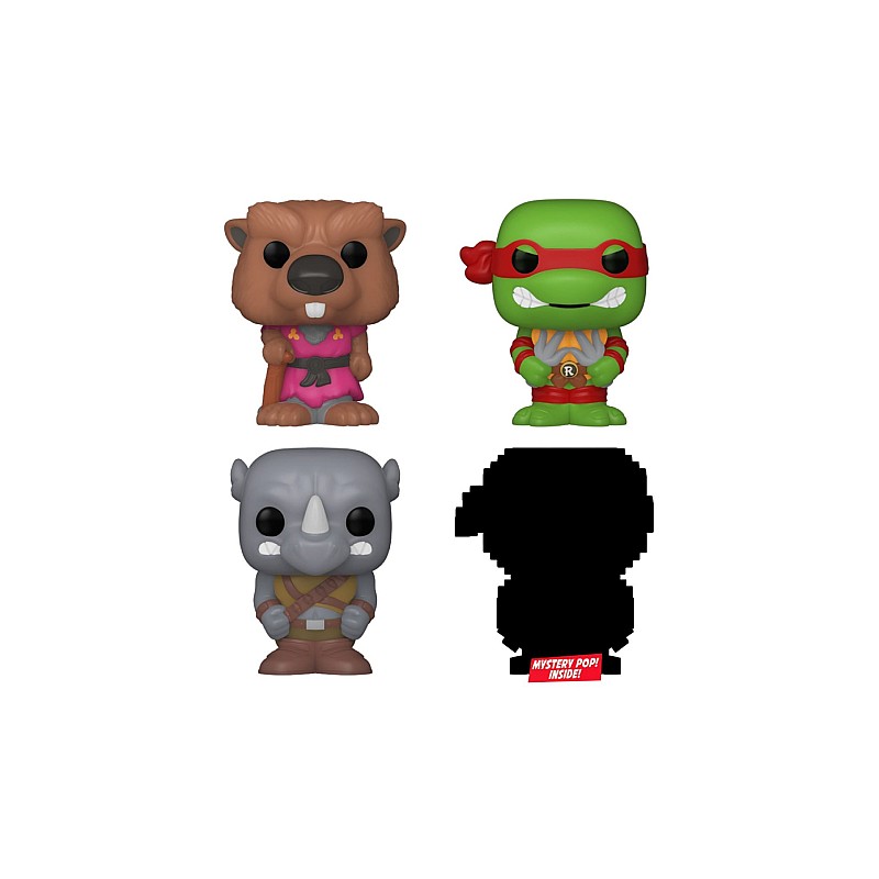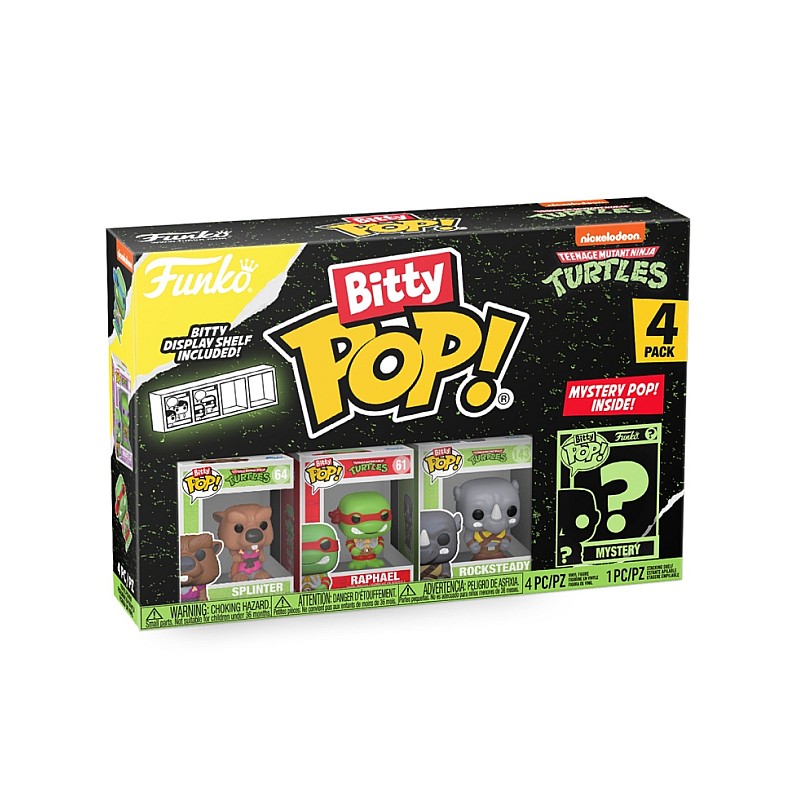 This 4-pack includes Bitty Pop! figures, namely Splinter, Raphael, Rocksteady and a Bitty Pop! mysterious.
