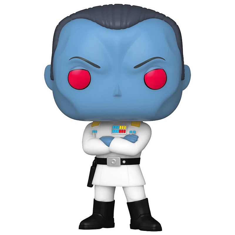 The Funko POP features Grand Admiral Thrawn in his distinctive white Imperial uniform, with his epaulettes decorated with the insignia of his high rank.