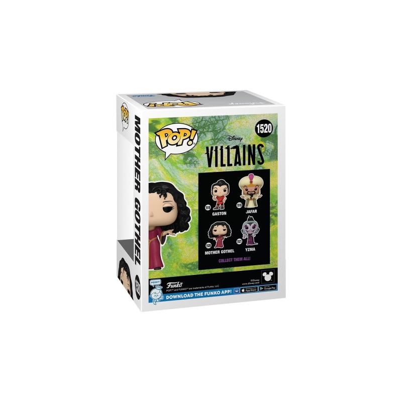 Mother Gothel is shown in all her glory, with long brown hair, dressed in the elegant dark dress that makes her an iconic character in the world of Disney.