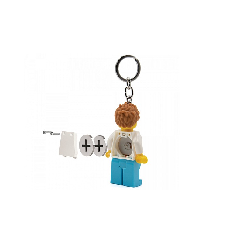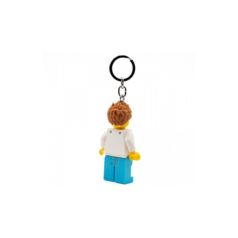 A Lego keychain with a doctor minifigure with movable arms, a glowing LED light in both legs and a button on the body to turn on the lights. Very cute for a school bag, jacket or stack of keys.