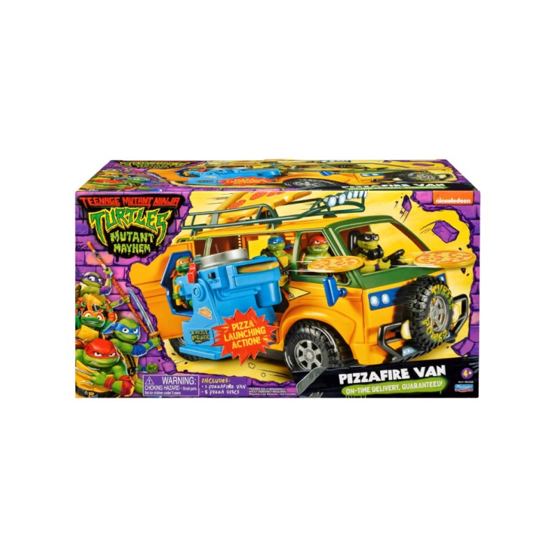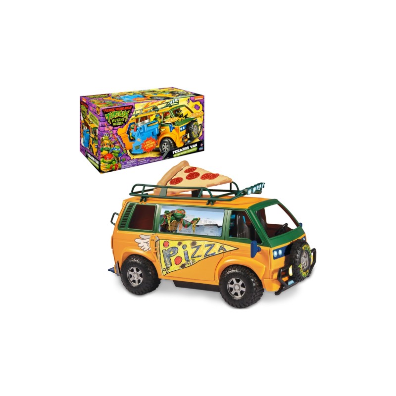 The pizza van is decorated in the signature style of the movie and includes fun and realistic details such as light-up headlights, spinning wheels and space for the figures to fit perfectly inside.