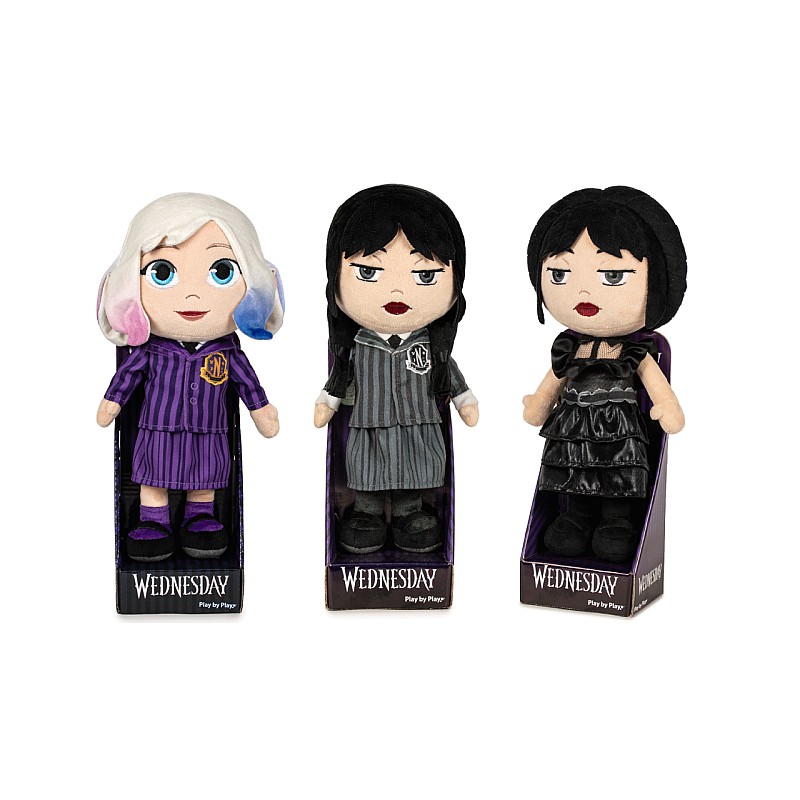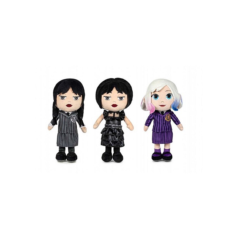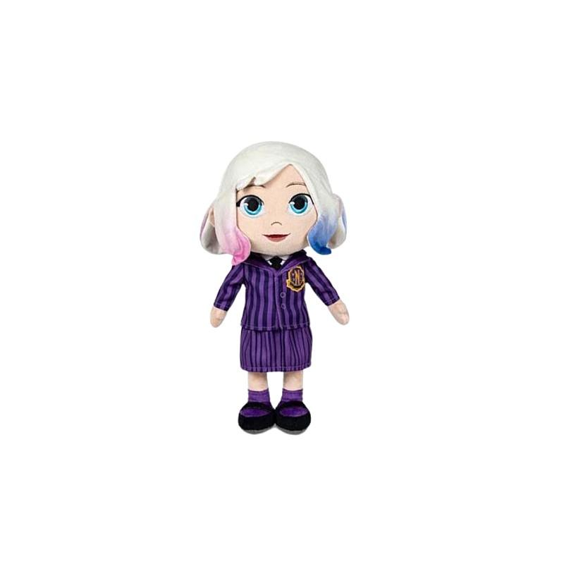 This plush toy represents Wednesday Addams, the iconic and enigmatic member of the Addams family.