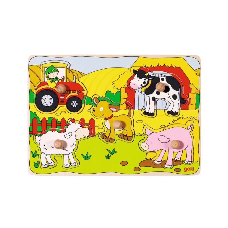The GOKI On the Farm Lift Out Puzzle is a charming wooden puzzle designed especially for young children.