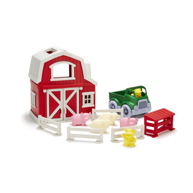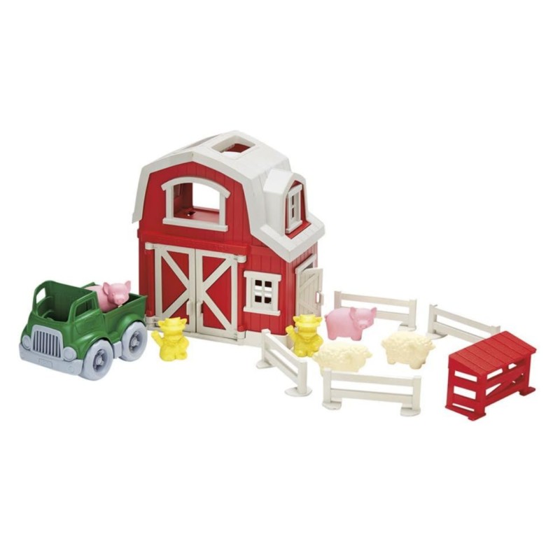 It's a busy day at Green Toy Farm. Inspiring cooperative play and communication, this playset includes a barn, truck, various animals (cows, sheep, pigs), fences and a stable for endless imaginative play.